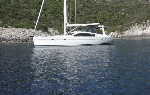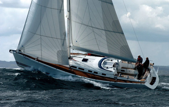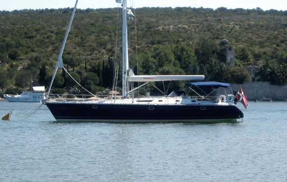 Beneteau 50 with her mid-boom sheeting on a trip at the Mediterranean with her