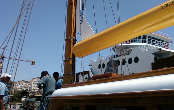 De Hoop Ketch here show all her canvas. Furlerboom, later on covered with wood, were chosen for the mizzen.